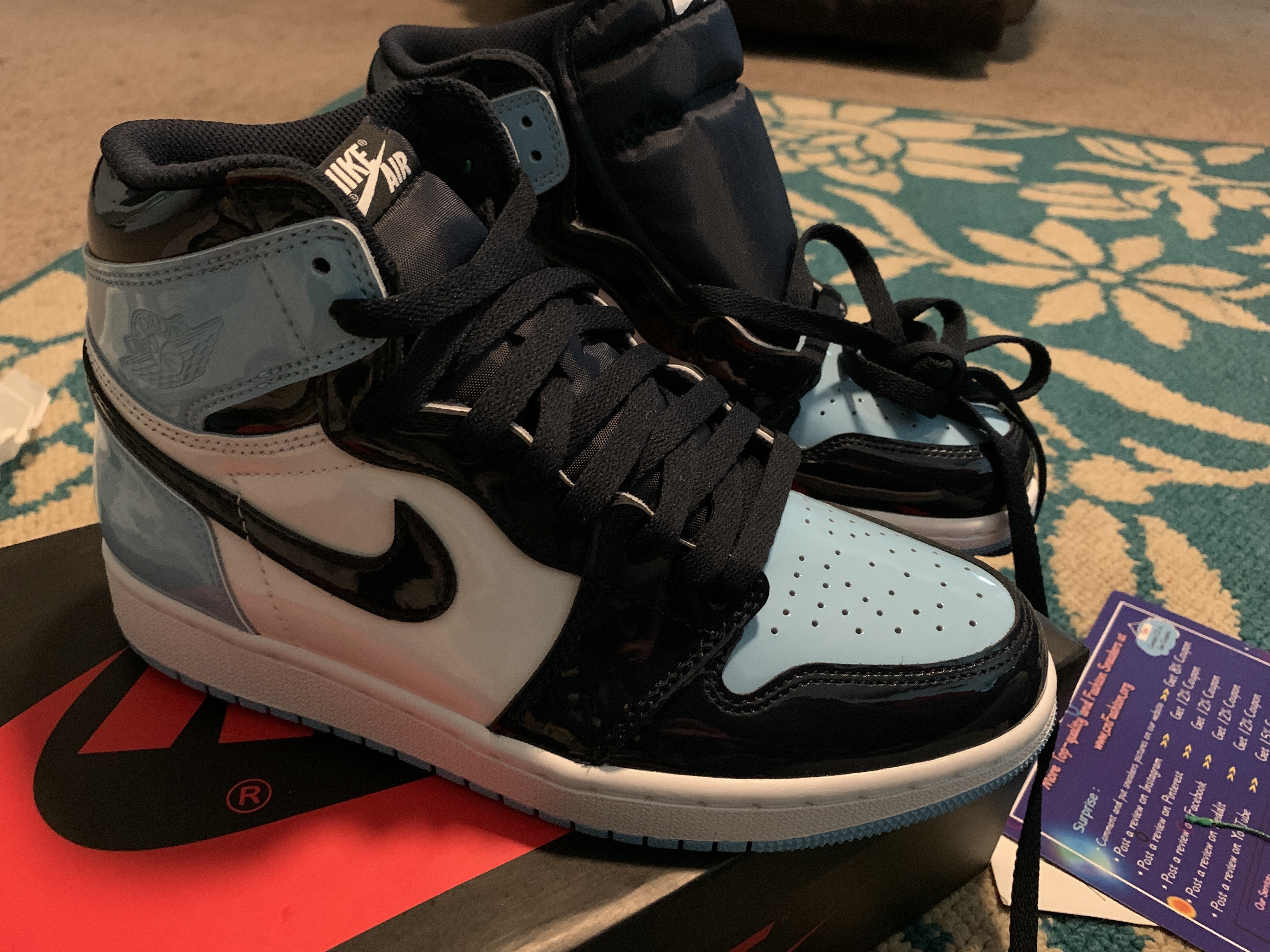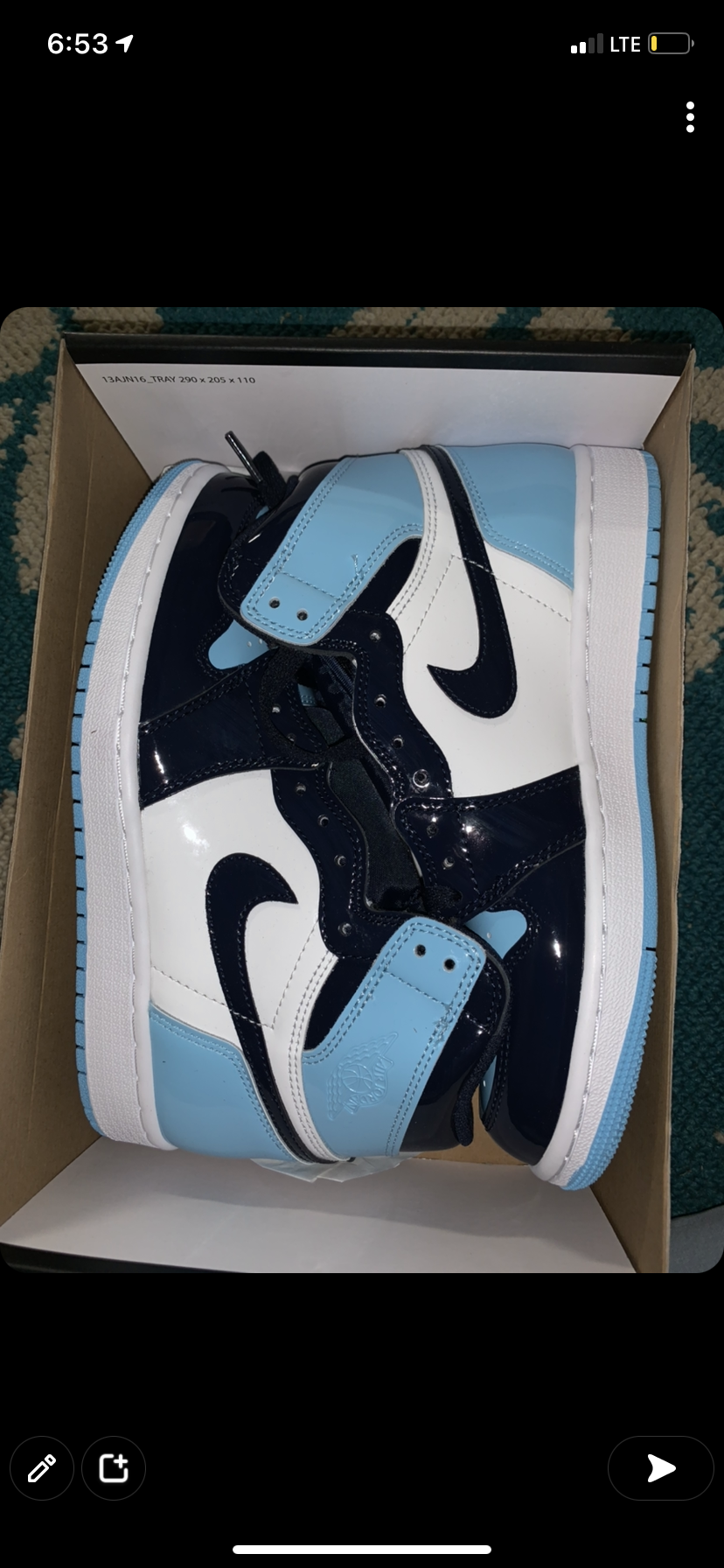 Show some respect to a basketball legend and cop the Jordan 1 Retro High UNC Patent (W). This AJ1 come with a white upper plus blue accents, black Nike “Swoosh”, white midsole, and a blue sole.